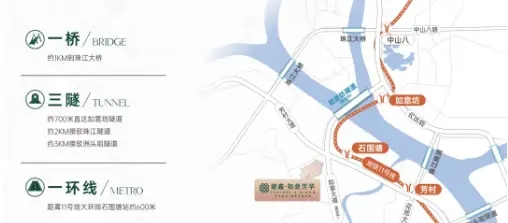 交通方面,步行约 800 米可达地铁 11 号线石围塘站,11 号线为广州首条大环线,1 站换乘 6 号线、2 站换乘 5 号线,可快速通达珠江新城、越秀、琶洲等中心城区。