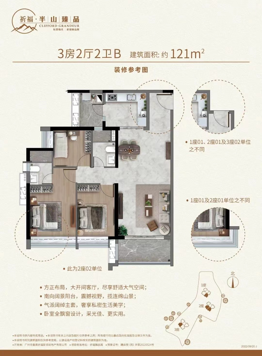 其中,建面约121平户型较受欢迎,户型较为方正,动静分离;南向观景阳台可赏山景;有两间卧室为全飘窗设计,通风采光俱佳。